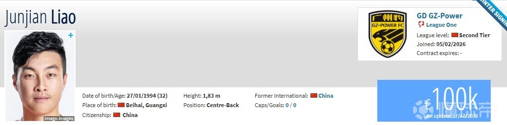 北京时间2月5日,德转更新,原梅州客家队长廖均健、原陕西联合门将陈俊旭加盟广东广州豹。