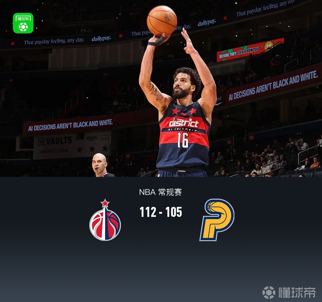 第四节奇才卡林顿拿下8分,步行者泰隆-皮特拿下9分,最终奇才112-105战胜步行者