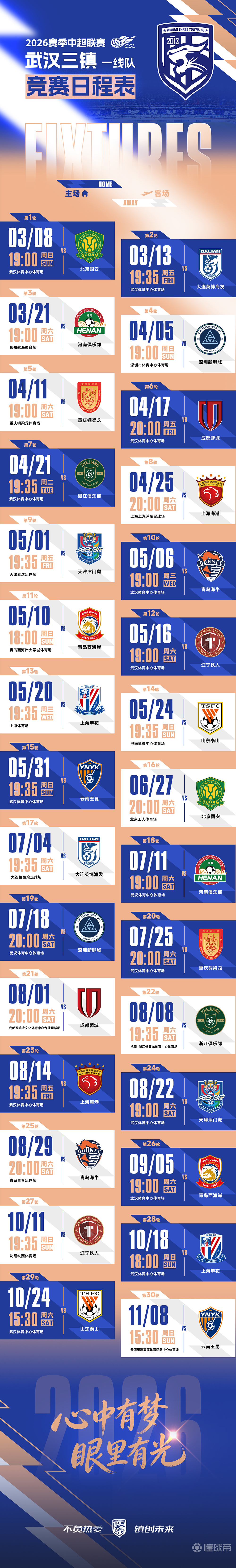 2月14日,2026怡宝中国足球超级联赛对阵日程表出炉。武汉三镇将以“两连主”开启新赛季征程,3月8日,三镇队将在联赛首轮中迎接北京国安的挑战。11月8日,三镇队将前往客场与云南玉昆进行联赛收官战。心中有梦、眼里有光,让我们一起为武汉而战! 武汉三镇队竞赛日程如图,请查收~