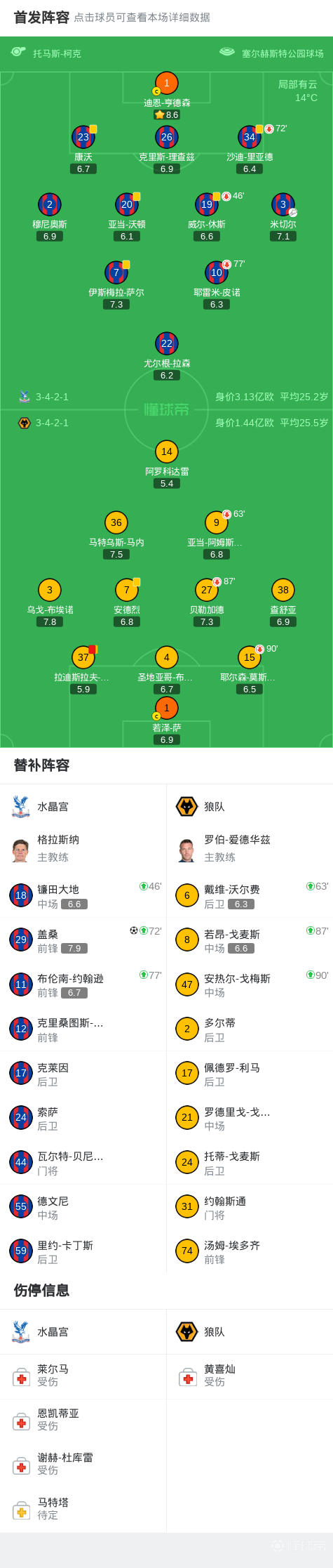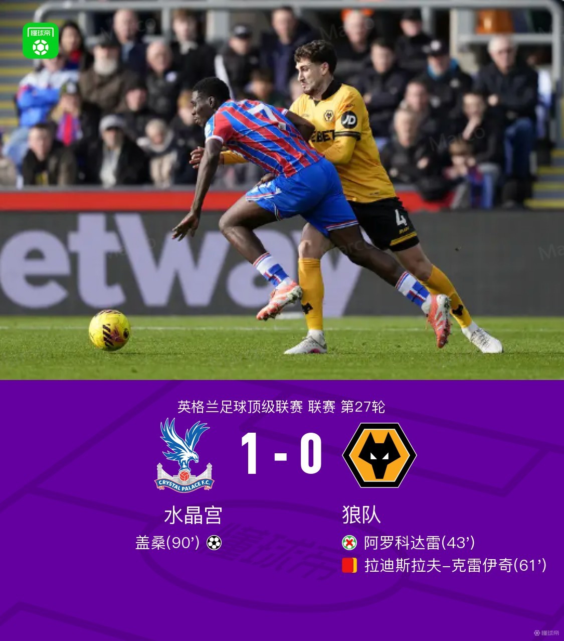 水晶宫1-0十人狼队,盖桑绝杀,阿罗科达雷丢点
