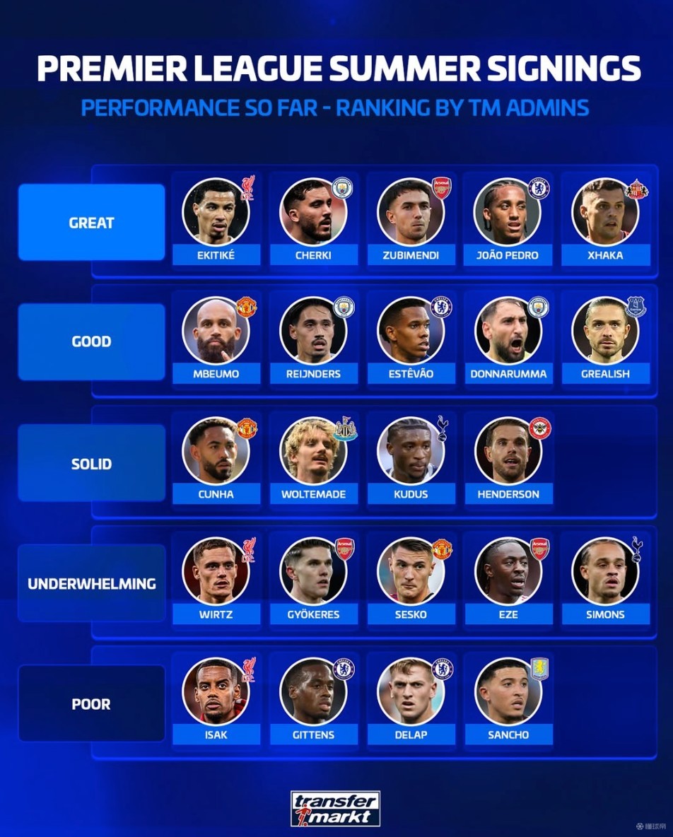 德转评英超俱乐部夏窗引援从夯到拉: