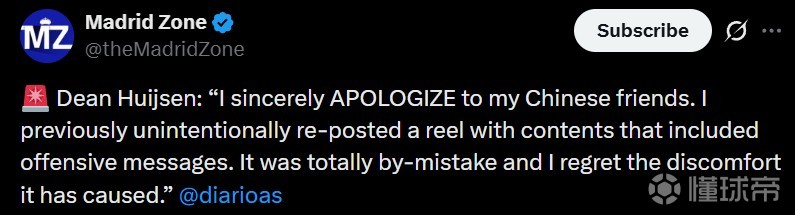赫伊森通过皇马在中国极具影响力的社交媒体平台微博发布了道歉声明。该平台月活跃用户约5.82亿。他在声明中表示:“我为我之前的转发行为真诚地向中国朋友们道歉。我不慎转发了一条含有冒犯性内容的帖子,这绝非我的本意,我对因此造成的伤害深表歉意。”