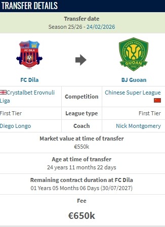 德转显示,马里中场孔特从哥里迪拉加盟北京国安的转会费为65万欧。