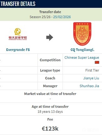 德转显示,重庆铜梁龙从恒大足球学校签下刘佳乐花费12.3万欧元,约100万人民币。