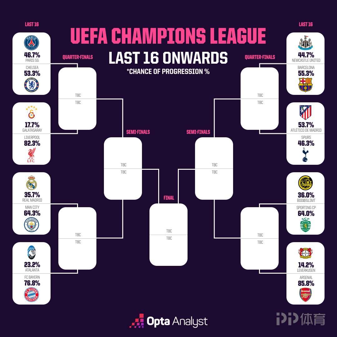 OPTA超算对欧冠1/8决赛进行了10000次模拟,各组对阵晋级概率如下。