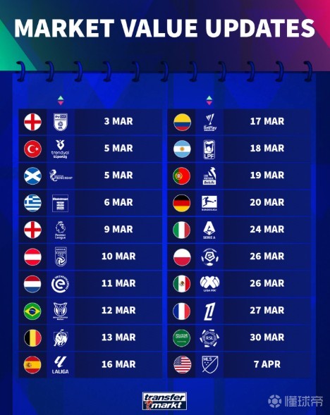 北京时间2月28日凌晨,德国转会市场公布了各联赛球员最新一期身价的更新时间,其中英超将在3月9日公布,西甲在3月16日公布,德甲在3月20日公布,意甲在3月24日公布,法甲在3月27日公布。
