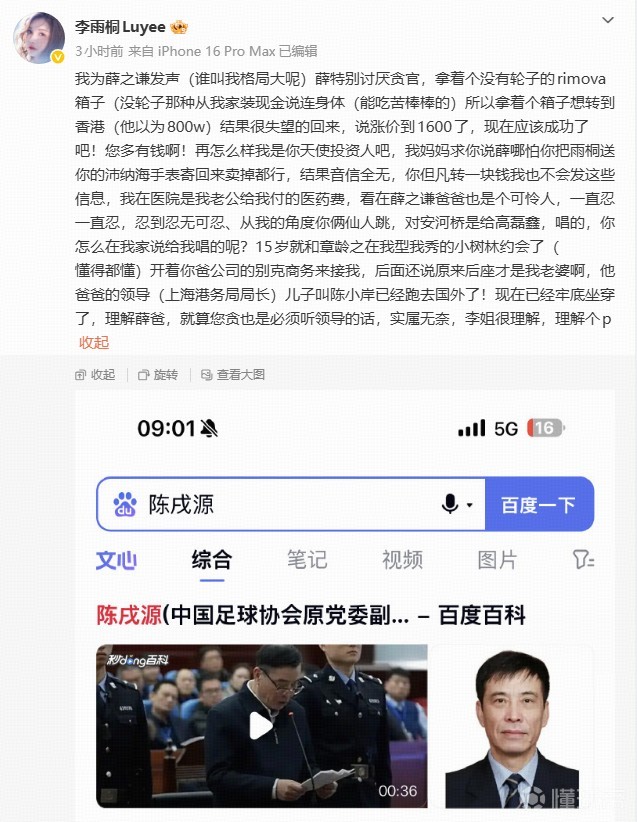 近日,内娱关于李雨桐和薛之谦的话题频频上热搜,两人曾是情侣关系,但分手并不体面。李雨桐这两天连续更博喊话薛之谦,今天她的一条内容意外出现了中国足协前主席陈戌源的名字。